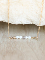 A lovely arrangement of gold balls, Howlite stones and a single Herkimer Diamond all on a gorgeous boxed chain.