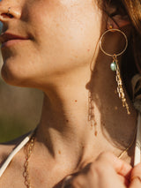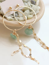 These gorgeous earrings have all the good stuff. Hoops, gemstones, and dangly chain all on a simple ball post. Features a ball-post earring style.