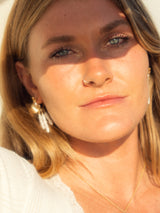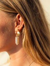 A simple, yet elegant huggie style hoop that features 3 biwa pearls in varying lengths.